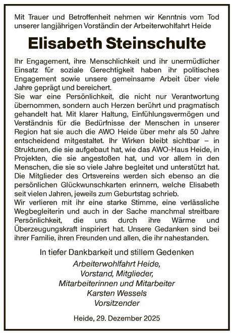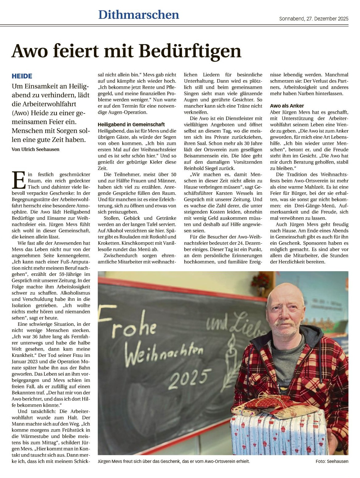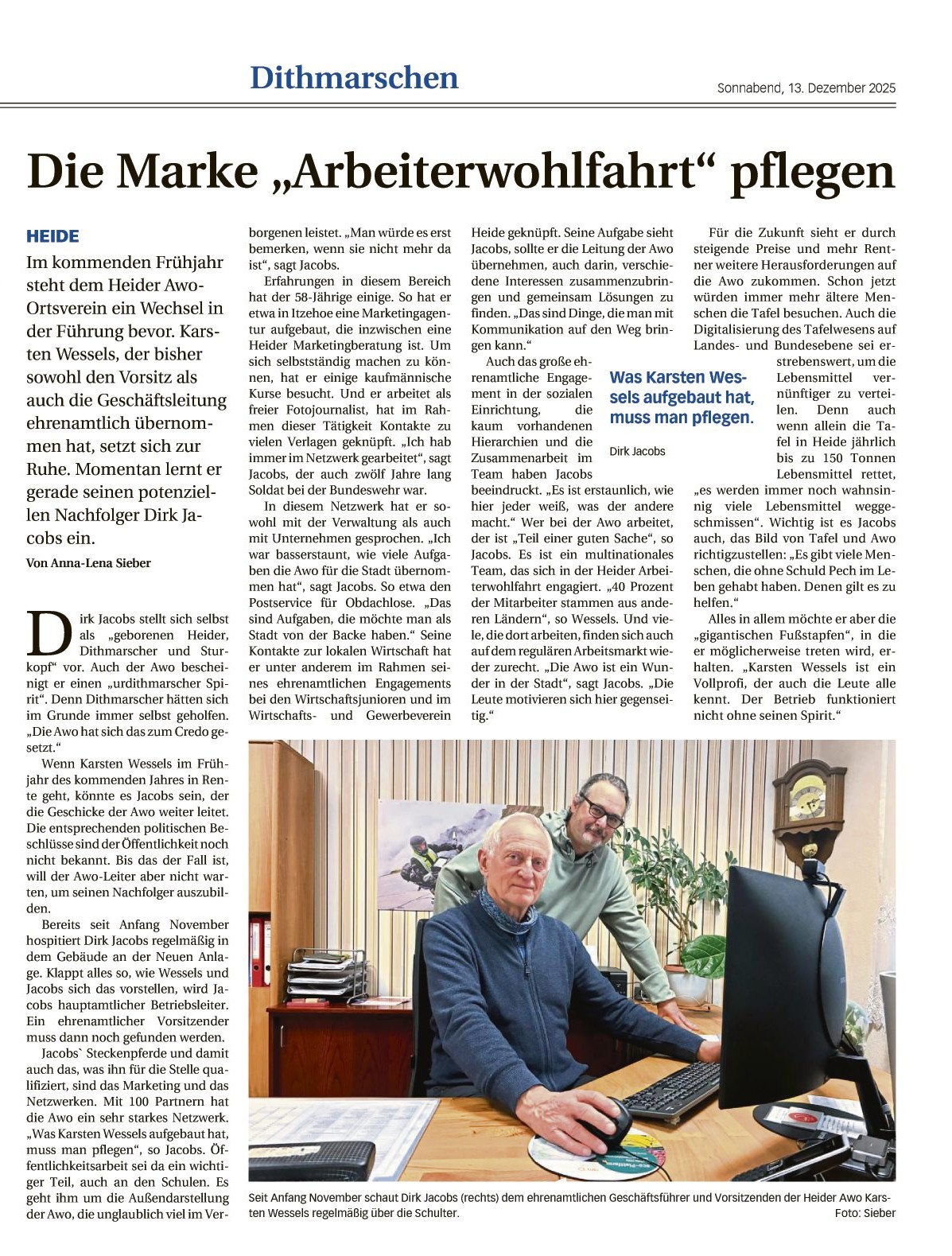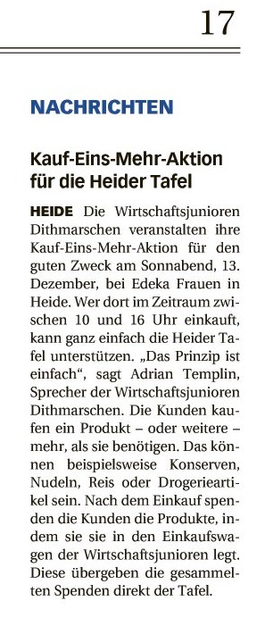 Presse Pressemitteilungen & Zeitungsberichte "Kauf-1-mehr!" WJ-Dithmarschen "Weihnachtsfeier bei der AWO" Wirtschaftsjunioren "kauf-1-mehr!" "Elisabeth Steinschulte" Die Marke "Arbeiterwohlfahrt" pflegen "Mit kleinem Budget Gesundes kochen" "Nachfolger gesucht" "Clubnacht erzielt hohe Spende" "Strahlende Küchenfee" "Auf Umwegen zum Traumjob" "Vom Kunden zum Leiter der Tafel" "Arbeit für die Tafel ist mehr als ein Job" "Tafeln stoßen an ihre Grenzen" "Partner für die warme Mahlzeit" "Heiligabend bei der AWO" "Sterntaler nötiger denn je" "Tatkräftig unterstützt" "Deutsch für Anfänger" "Dithmarscher helfen Dithmarschern" "Ein Macher sagt bald Tschüs" "Die gerechte Verteilung im Blick" "Biker spenden für die Kindertafel" "Neues Jahr, bekannte Herausforderungen (AWO Heide)"